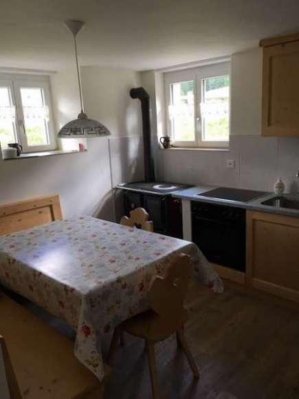 Obere Wohnung (Nr. 023A) für 1 - 4 Personen mit separatem Eingang: Wohn-Esszimmer mit Tisch und Stühlen. Gosse neue Küche mit Holz- und Elektrokochherd, Backofen, Kühlschrank und weitere Küchengeräte. 2 Doppelschlafzimmer. Neues Badezimmer mit Dusche, WC, Kleiderwaschmaschine und Lavabo. Hausheizung mit Holz und Strom. Schöner Sitzplatz mit Grill/Kamin, Tisch und Stühlen. Grosse Wiese beim Haus zum Spielen für Kinder, zum Verweilen und Sonnenbaden. 1 Kinderbett oder 1 Zustellbett für 1 Kind auf Anfrage.