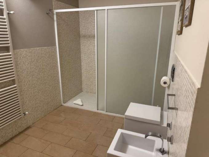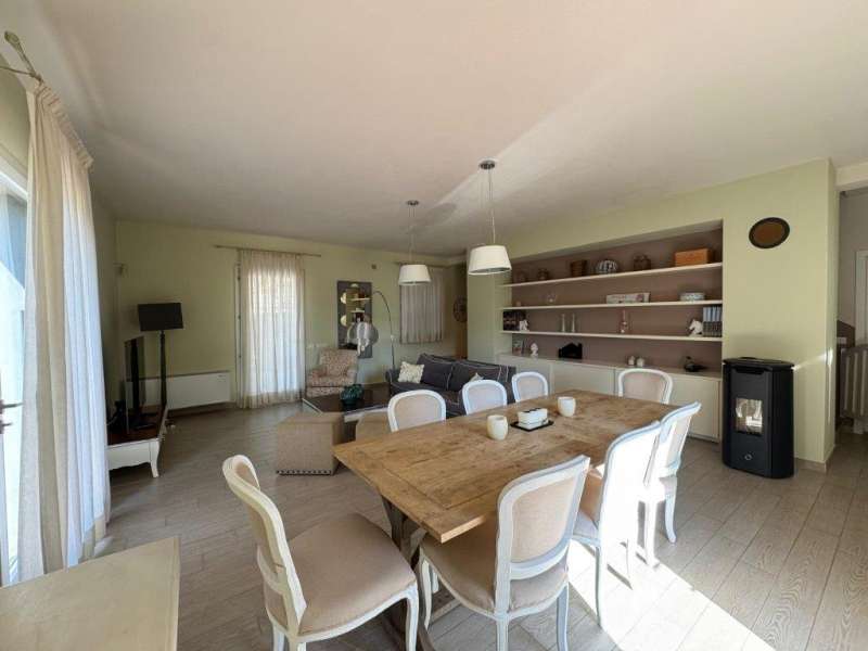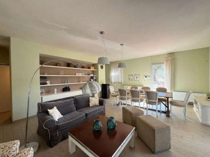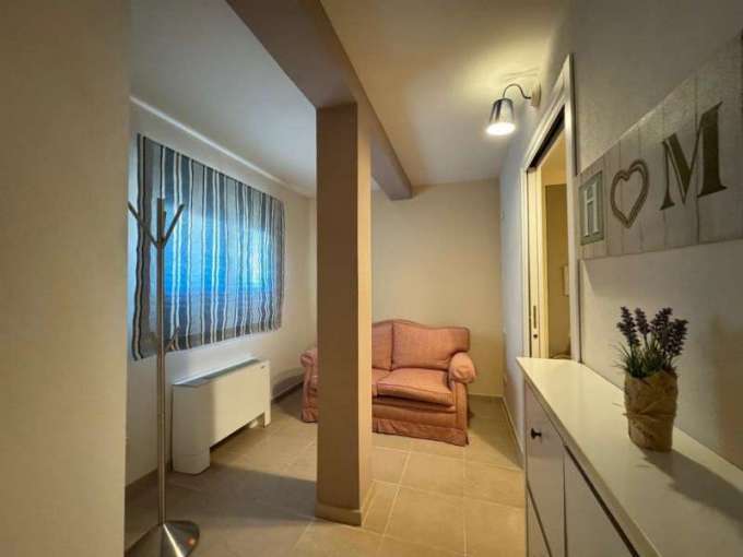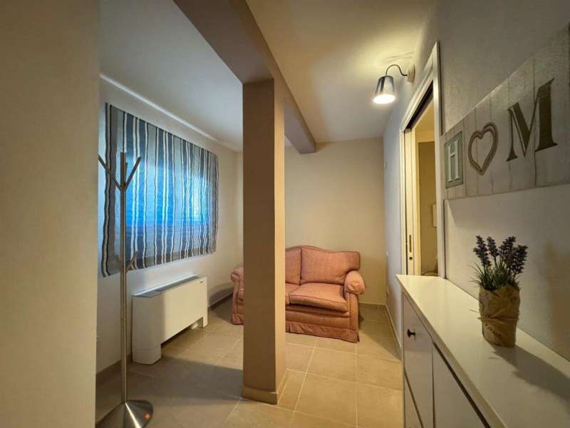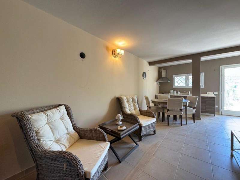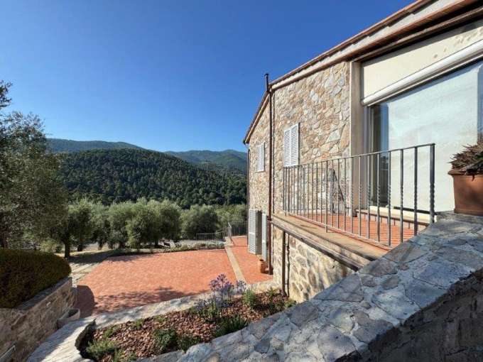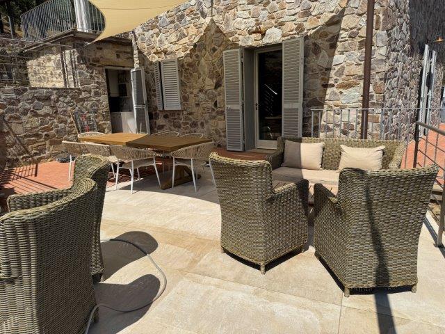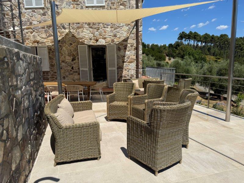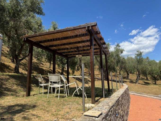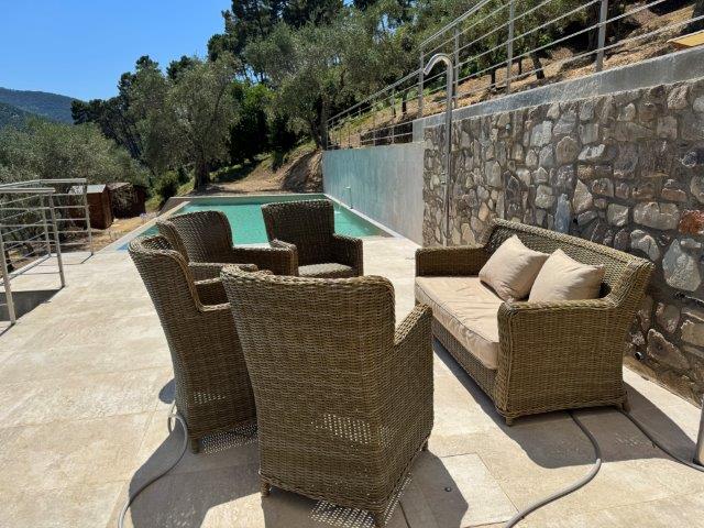 Ferienhaus: Mittels einem Eisentor und Privatweg. den Hügel hinauf bis zum Ferienhaus. Eingang im Erdgeschoss: Zusatzküche mit Herd, Kühlschrank, Tisch, Stühle, 1 kleiner Ofen (Pellets), 1 Schlafzimmer mit 1 Stockbett, 1 Doppelbettzimmer mit Vorzimmer mit 2 Sessel und kleinem Tisch, 1 Badezimmer mit grosser Dusche, WC, Bidet. Treppe in den 1. Stock (auch Erdgeschossniveau, da das Gelände in Terrassen angelegt ist): 1 grosser Salon mit 2 Sofas und Sesseln, ein Ofen (mit Pellets), Esstisch, SAT-TV, W-Lan, Kinderhochstuhl, Ausgang auf die Veranda und Schwimmbadzone. Ausgang auf einen grossen Aussenbereich, ausgestattet mit Tisch, Stühlen, Sonnenschirm für Ihr Essen im Freien, Hauptküche mit Herd, kleiner Tisch mit Hocker, elektr. Ofen, Kühl-Gefrierschrank, Geschirrspüler, Filterkaffeemaschine, Mikrowelle, 1 Badezimmer mit Waschbecken, Bidet und WC. Treppe in den 2. Stock (mit einem Kindersicherheitsgitter geschlossen): 1 Doppelbettzimmer mit 1 Pouf (Einzelbettsofa), Fenster mit traumhafter Aussicht, 1 Badezimmer mit Dusche, WC, Bidet, 1 Durchgangs-Einzelbettzimmer mit grossen Fenstertüren (welche verdunkelt werden können) und Aussicht in den Garten und Olivenhaine, von hier Zugang auf die Hinterseite des Gartens, mittels disem Einzelbettzimmer Zugang zu 1 weiteren Doppelbettzimmer. Vom Salon im 1. Stock mittels einer Fenstertüre Ausgang auf einen Aussenbereich mit Tisch und Sofa (Rattan), 4 Sonnenliegen (Rattan), mit direktem Zugang zum Schwimmbadbereich.